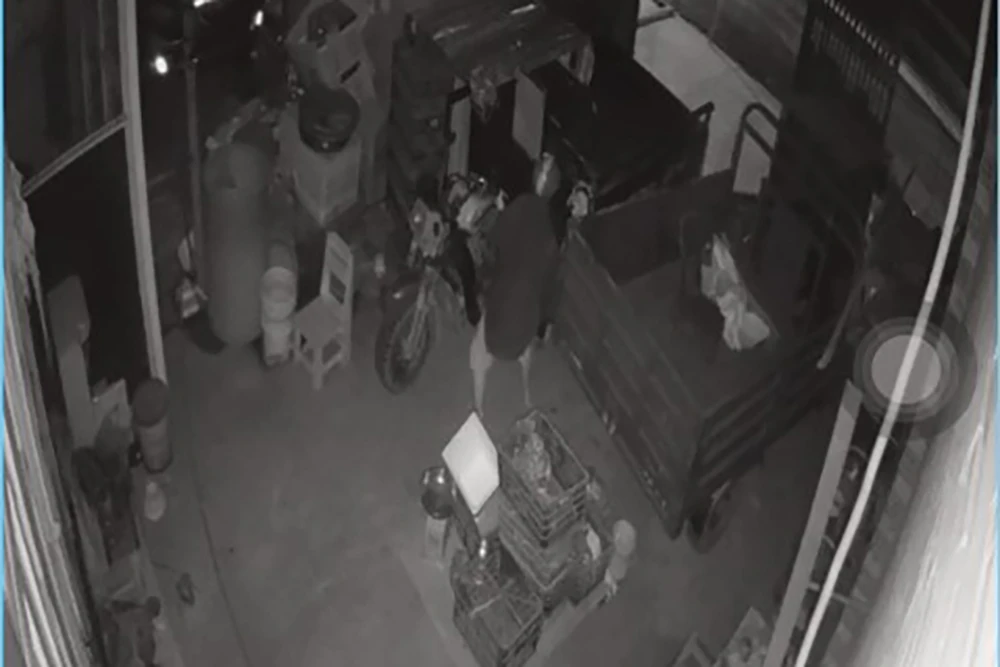Theo hình ảnh từ camera an ninh, tên trộm bẻ khóa, bò vào khu vực sân rồi đi lòng vòng ở sân để tìm tài sản giá trị nhưng không thấy. Cuối cùng, người này cắt ổ khóa xe ba gác máy đồng thời bẻ hai ổ khóa cửa để đưa chiếc xe ba gác ra ngoài, tẩu thoát.