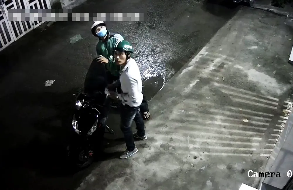 Hình ảnh cho thấy vào 20 giờ 7 ngày 20-6, một thanh niên mặc đồ Grabike chở theo một nam thanh niên khác dừng trước khu nhà trọ, phía sau có một thanh niên chạy chiếc Exciter chạy theo.