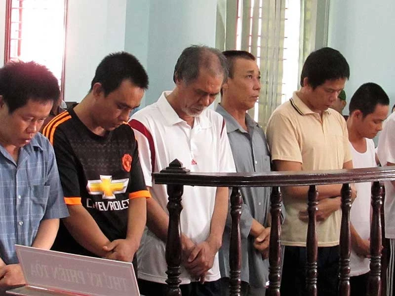 Bị cáo Lê Văn Mười (thứ hai từ trái qua) cùng các đồng phạm nghe tòa tuyên án. Ảnh: NN