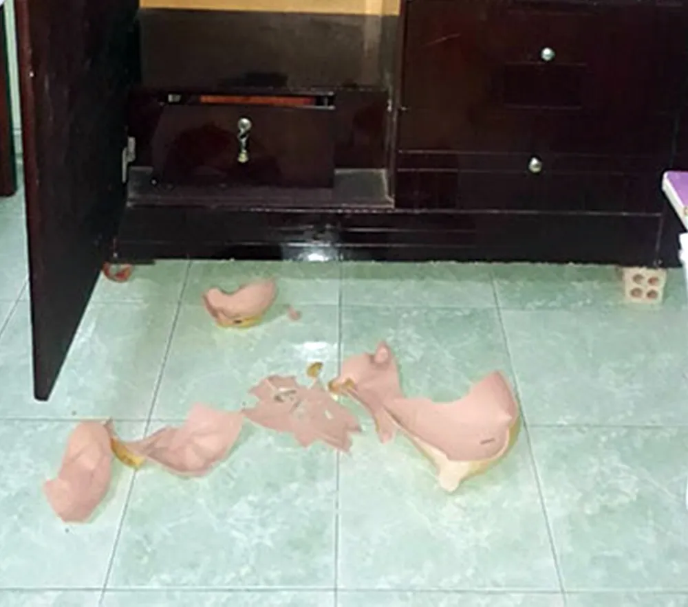 Tại hiện trường, hai khoen khóa trên và dưới cửa chính đã bị bẻ gãy bằng kềm cộng lực. Kẻ trộm đột nhập phòng ngủ, lục tung đồ đạc và lấy con heo đất đập vỡ ngay trên nền nhà. Ngoài số tiền 30 triệu đồng tiết kiệm của gia đình để dành trong heo đất, bọn trộm cũng lấy đi chiếc iPad trị giá 9 triệu đồng.