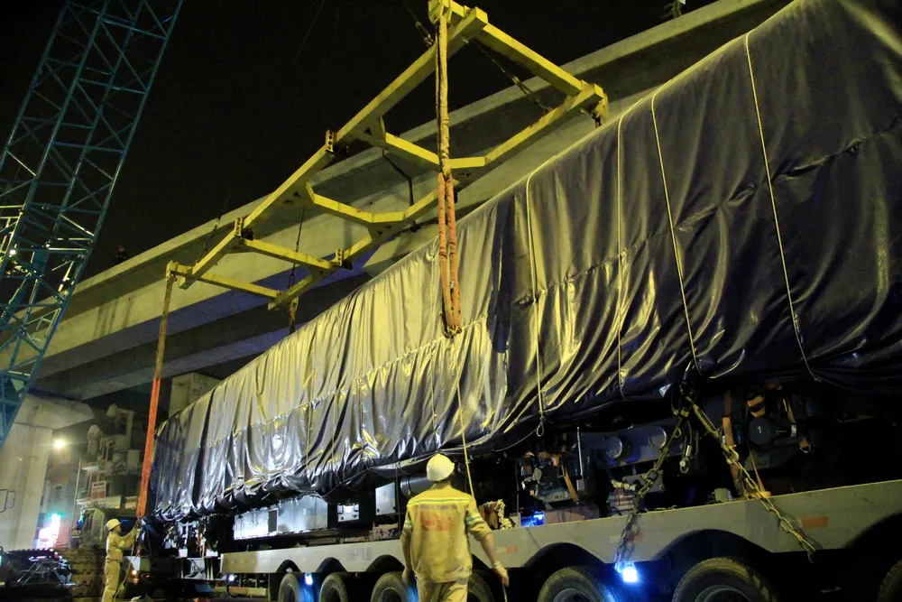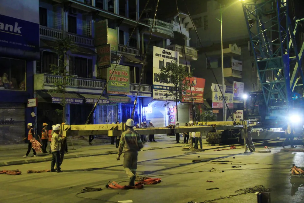 Đêm qua và rạng sáng nay các toa tàu lần lượt, nhanh chóng được đưa lên đường ray phía bên trên.