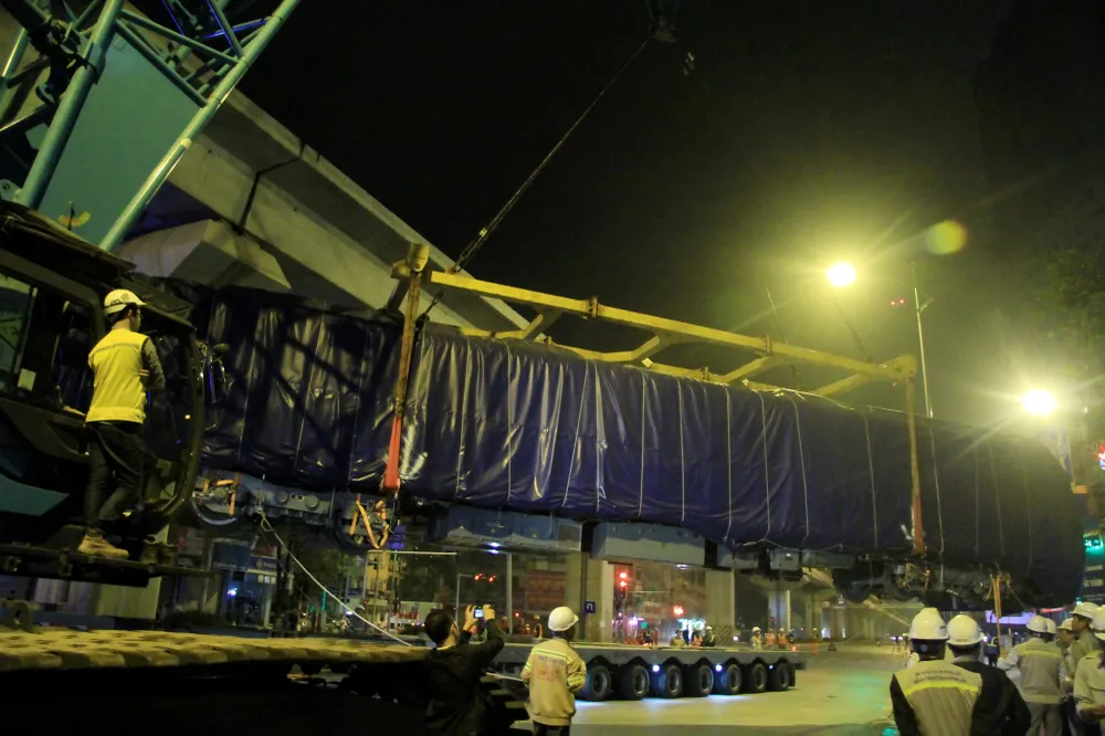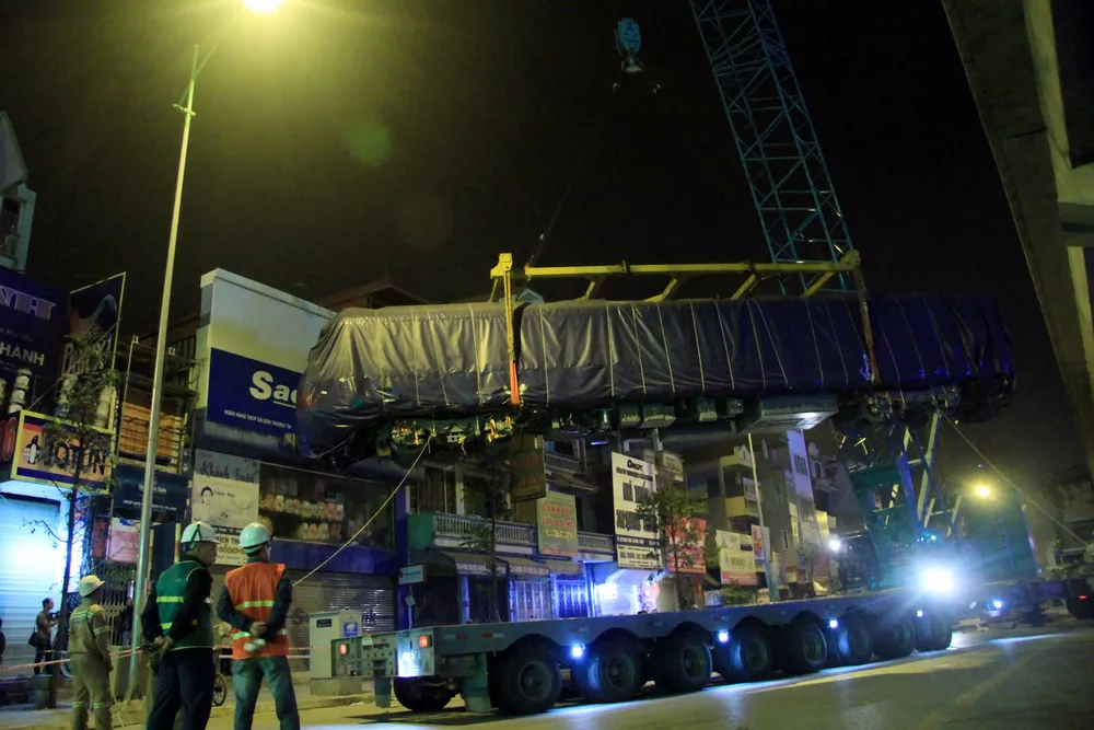 Gần 3 giờ sáng 21-2, toa tàu đầu tiên đã được cẩu thành công lên ray đường sắt trên cao Cát Linh - Hà Đông (Hà Nội).