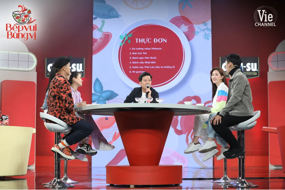 Khi thưởng thức bàn đại tiệc với rất nhiều món ngon châu Á, MC Trường Giang đã đưa ra chủ đề để mọi người cùng thảo luận: “Khi đi du lịch với người yêu, có nên dắt bạn theo cùng hay không?”.