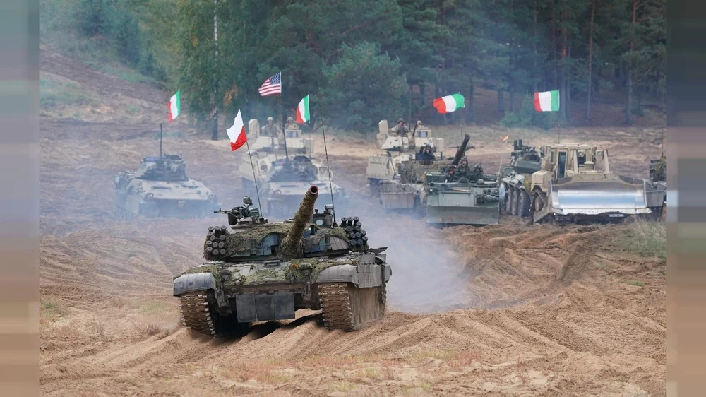 Xe tăng của Ba Lan, Ý, Canada và Mỹ trong cuộc tập trận Namejs 2021 của NATO. Ảnh: AP
