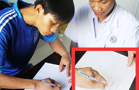 BS Võ Thái Trung đang xem anh Tuyến viết chữ bằng ngón tay cái tái tạo từ ngón chân. Ảnh: TRẦN NGỌC
