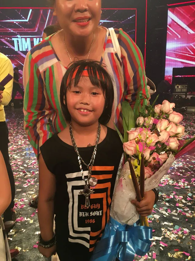 Trọng Nhân nhỏ bé trên sân khấu Vietnam's Got Talent bên người dẫn chương trình Diệp Lâm Anh. Cậu bé giành giải quán quân nhờ có lượng bình chọn cao nhất từ khán giả. Ảnh: VNExpress