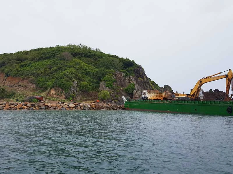 “Vết chém” trên chính là con đường mới mở, đang san ủi, chạy từ bãi biển lên đỉnh đảo. Nhiều nơi trên đảo đang bị đào bới tan hoang. Vào thời điểm này, chúng tôi thấy một sà lan chở đá từ đất liền ra đang chờ để đổ xuống biển. Dọc bãi biển ven đảo, nhiều sà lan, xe múc đang ầm ầm đổ đá lấp biển, hình thành một mặt bằng mới lấn ra biển, dài hàng trăm mét, nhô cao hơn mặt nước hơn 1 m. Nét tự nhiên của một trong những hòn đảo đẹp nhất vịnh Nha Trang gần như biến mất.