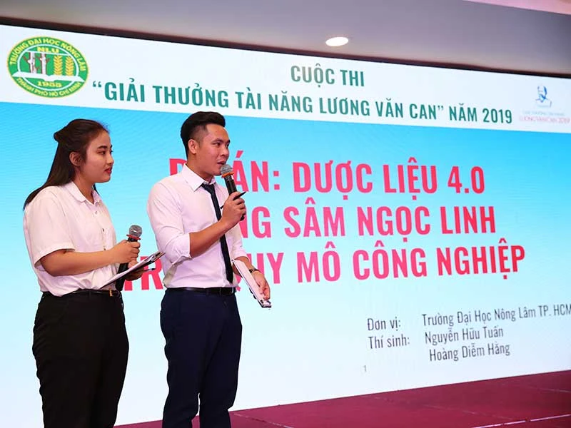 | Giải thưởng tài năng Lương Văn Can 2019 thu hút 2.000 sinh viên đến từ 16 trường đại học trong và ngoài nước tham gia. Đề án Dược liệu 4.0 (Trồng nhân sâm bằng phương pháp khí canh trên quy mô công nghiệp) giành giải nhất Giải thưởng tài năng Lương Văn Can 2019. Giải nhì thuộc về Thùng rác thông minh FOW của hai thí sinh Huỳnh Tấn Long và Nguyễn Bảo Châu (Trường ĐH Công nghệ TP.HCM). Chế phẩm sinh học TDM EM Beta giúp sản xuất phân hữu cơ từ phế liệu trồng nấm của nhóm thí sinh Huỳnh Văn Sĩ, Phạm Tuấn Anh, Trương Diễm Linh (Trường ĐH Thủ Dầu Một) giành giải ba. Hai giải khuyến khích thuộc về Đũa Việt của Trường ĐH Nguyễn Tất Thành và Triac Farm - Hệ thống giám sát, điều khiển và cảnh báo vườn rau của Trường ĐH Thủ Dầu Một. |