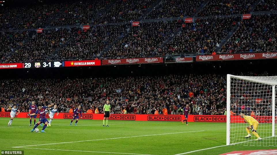 Kế hoạch có điểm trên sân Nou Camp của Deportivo sớm phá sản khi chủ nhà Barca có được bàn thắng nâng tỉ số lên 3-1. Phút 69, Messi cũng ghi tên mình lên bảng điện tử khi có cú sút chân trái sở trường trước vòng cấm đưa bóng vào góc cao, làm bó tay thủ môn của đội khách.