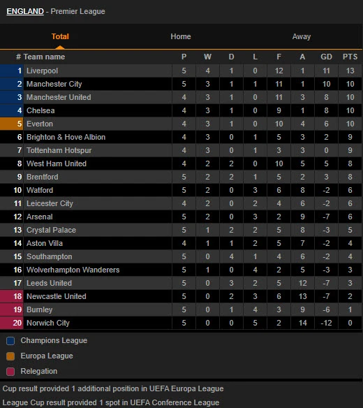 Bảng xếp hạng Premier League:
