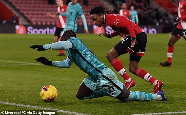 Tình huống Mane ngã trong trận đấu Liverpool thua Southampton 0-1. ẢNH: GETTY