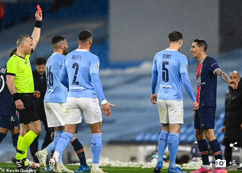 Di Maria nhận thẻ đỏ vì pha chơi bóng tiểu xảo. ẢNH: @KEVIN QUIGLEY