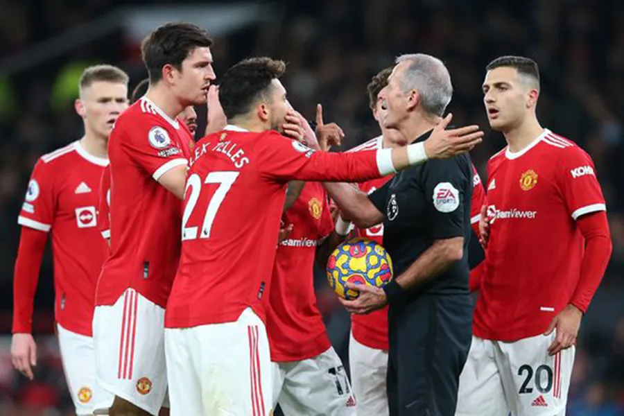 Trọng tài Atkinson công nhận bàn thắng bất chấp sự phản đối của cầu thủ MU. ẢNH: GETTY