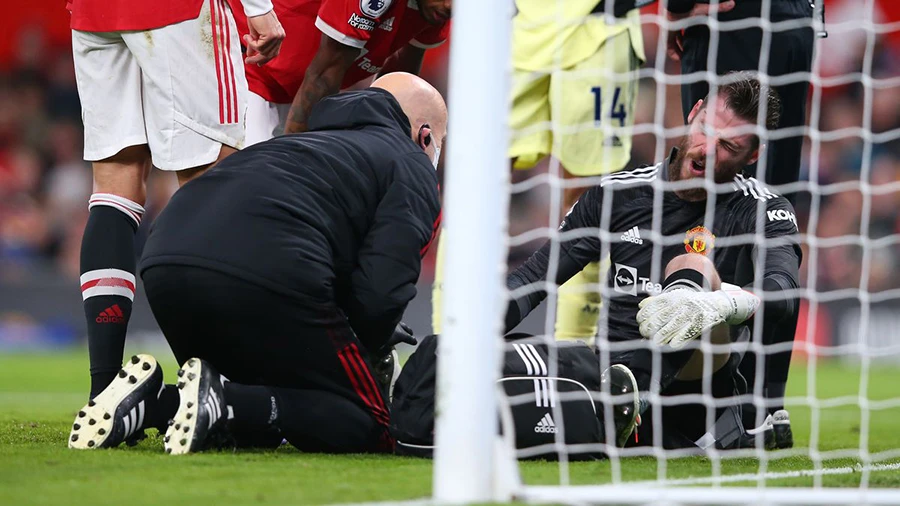 De Gea phải cần đến sự chăm sóc của đội ngũ y tế sau khi bị đồng đội Fred dẫm vào chân. ẢNH: GETTY