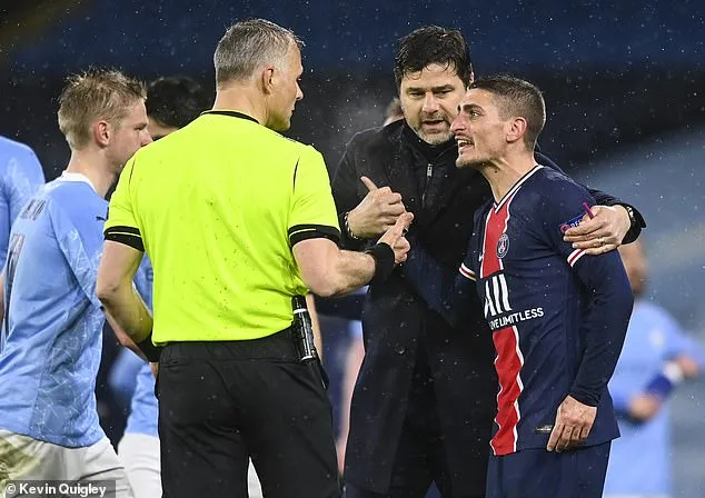 Verratti tranh luận với Kuipers sau trận đấu. ẢNH: KEVIN QUIGLEY