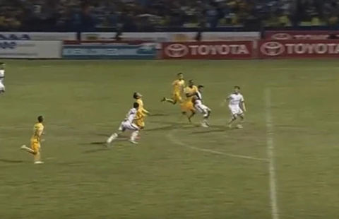 Pha bóng phạm lỗi ở ngoài khu 16,50 m rất xa nhưng được trọng tài biến thành quả 11 m cho chủ nhà FLC Thanh Hóa. Ảnh: Chụp lại từ VTV6