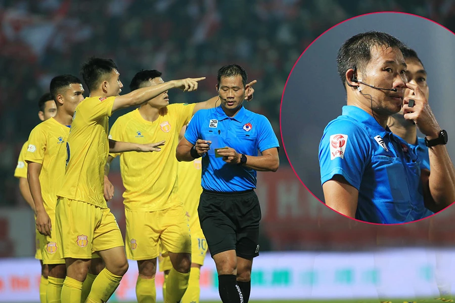 Hy hữu khi đội Nam Định đề nghị xem lại “VAR” và tổ trọng tài đã xem lại tình huống từ màn hình lớn ở sân Lạch Tray trước khi “bẻ còi”. Ảnh: ANH THỎA