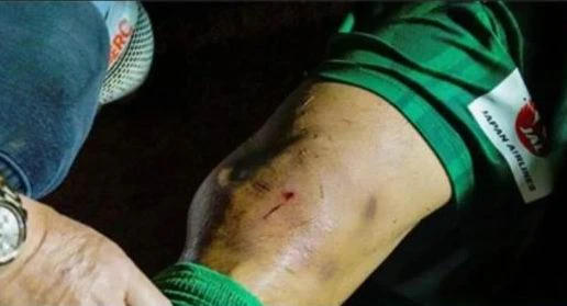 Gối Công Thành bị sưng tấy và biến dạng sau cú đạp bóng. Ảnh: CTV