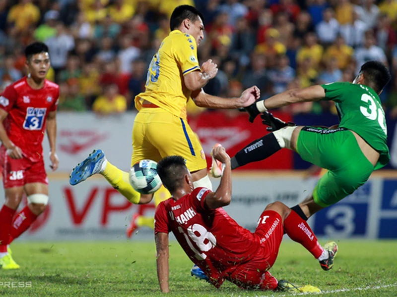 Trọng tài trận Nam Định - Hải Phòng bị treo còi vì nhiều tình huống làm Nam Định thua oan, trong đó có tình huống thủ môn Văn Toản phạm lỗi với Merlo nhưng không thổi 11 m mà để Hải Phòng phản công và ăn bàn. Ảnh: VNExpress