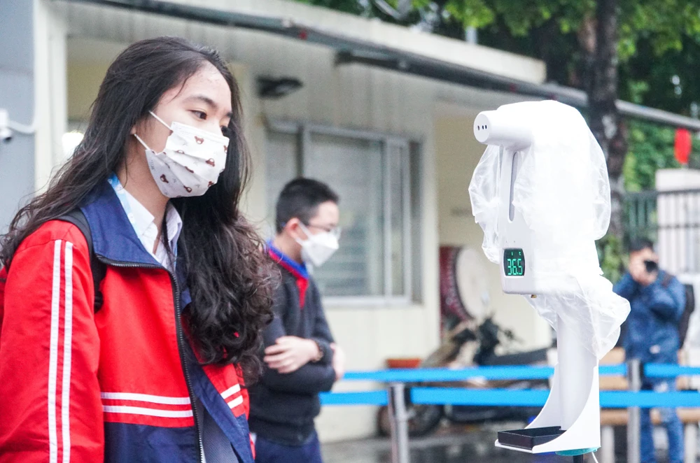 Tại trường THCS Dịch Vọng (Cầu Giấy, Hà Nội), học sinh được đo thân nhiệt ở cổng, tiếp đo sát khuẩn tay và đi theo vạch kẻ sẵn. Mỗi cây đo thân nhiệt sẽ có một cán bộ, giáo viên đứng hướng dẫn cụ thể việc đo nhiệt độ, cũng như sát khuẩn tay. Những học sinh tự đi phương tiện cá nhân tới sẽ phải di chuyển ra phía sau vào cổng riêng.