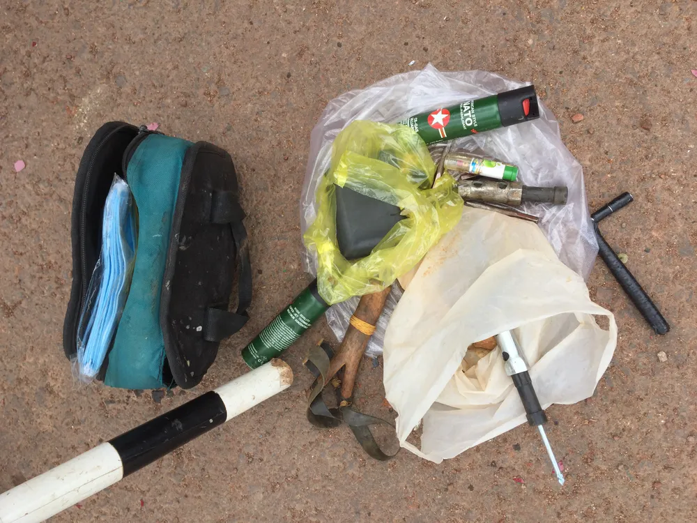 Điều đáng nói là người dân phát hiện trong túi xách của các nạn nhân có chứa nhiều bình xịt hơi cay, đoản bẻ khóa, ná thun, đá, sỏi (đạn dùng để bắn ná thun)…
