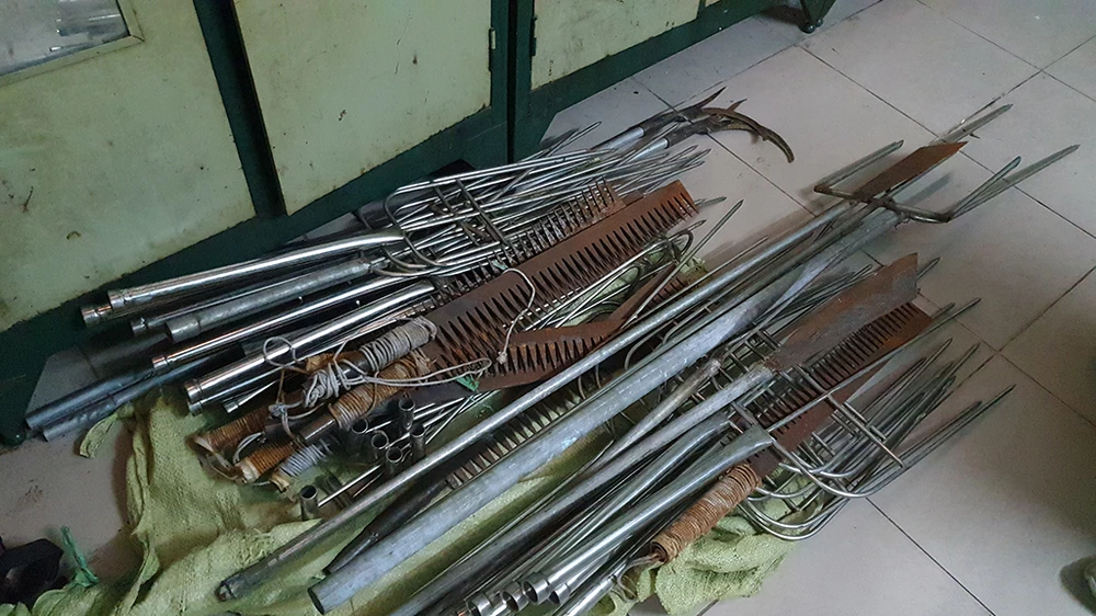Lực lượng chức năng phát hiện hàng chục hung khí tự chế như ba chĩa, dao… cùng một khẩu súng. Tại thời điểm kiểm tra, trong nhà chỉ có bà Dung.