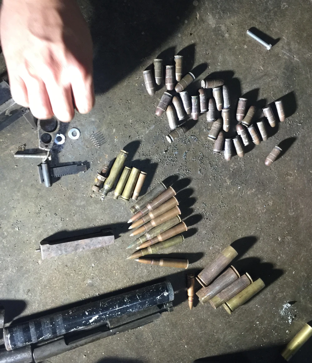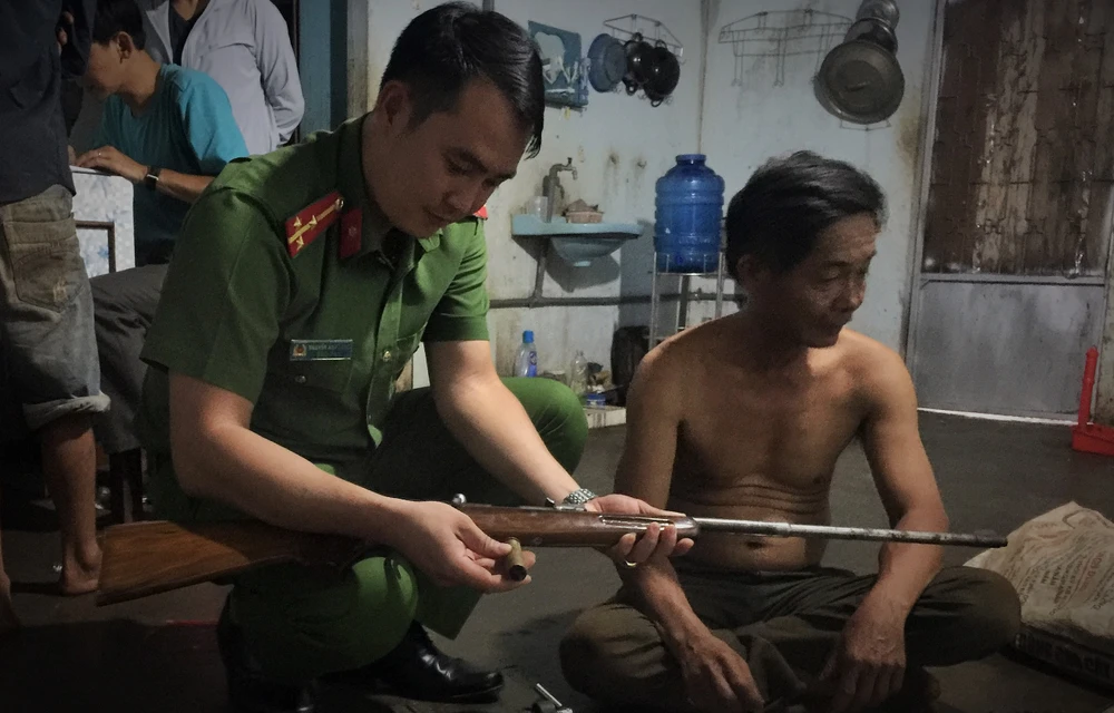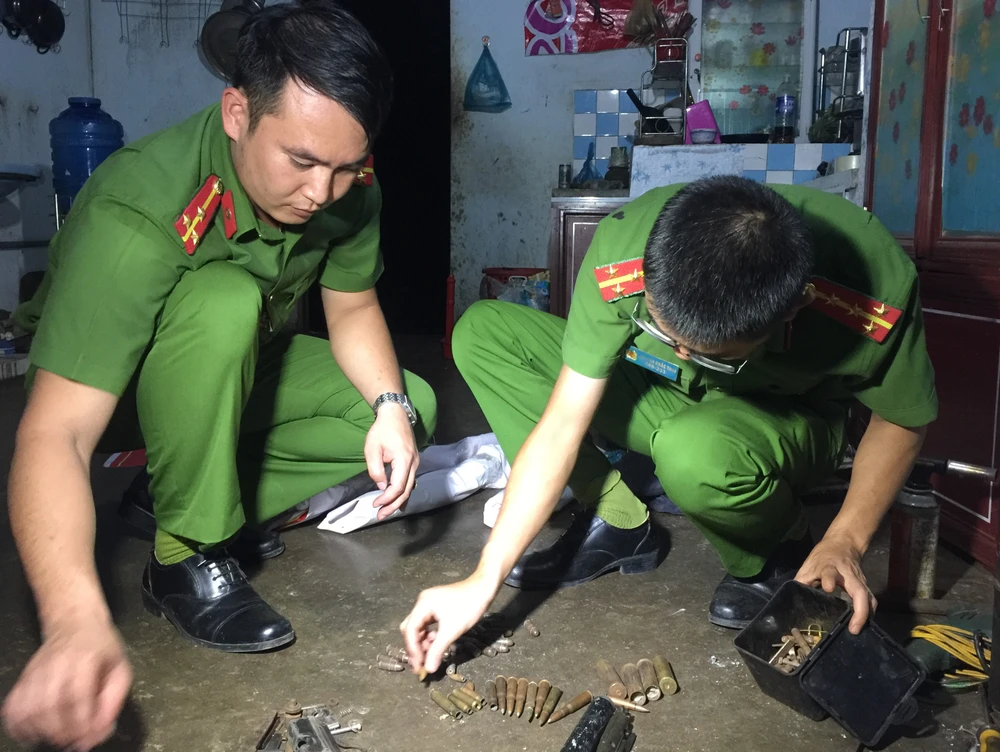 Công an đã kiểm đếm, lập biên bản thu giữ bảy khẩu súng gồm súng hơi, súng klip, súng thể thao; hàng trăm viên đạn, đầu đạn, nhiều báng súng, linh kiện của các loại súng; một chai thuốc bồi và máy móc để chế tạo, sửa chữa súng đạn.