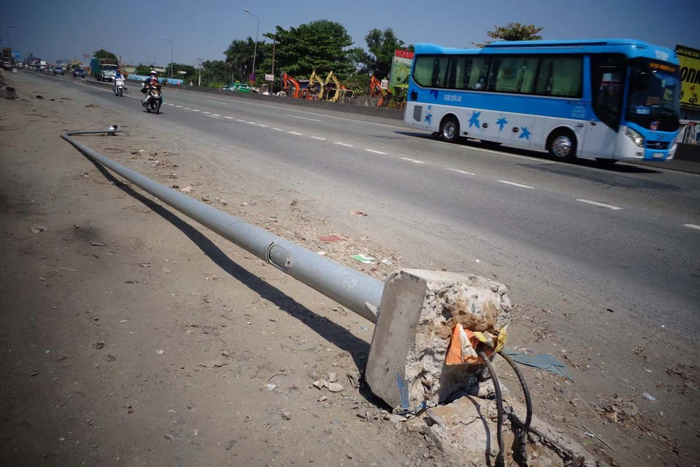 Trên xa lộ Hà Nội, đoạn qua phường Bình Thắng, TP Dĩ An, nhiều đoạn được mở rộng và nâng cấp nhưng trụ đèn vẫn chưa được dời vào sát lề nên rất nguy hiểm đối với người đi đường.