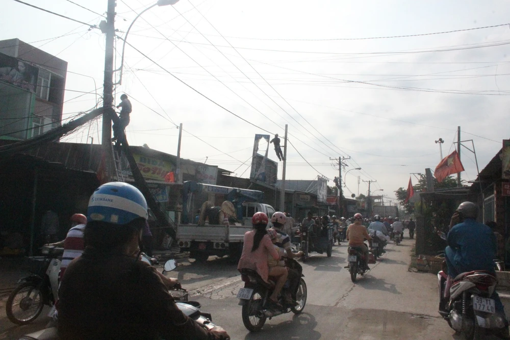Nhân viên điện lực Hóc Môn đến ghi nhận và phối hợp cùng nhân viên của các nhà mạng Viettel, VNPT, FPT, truyền hình cáp SCTV... tiến hành khắc phục sự cố, trồng mới cột điện, nối đường dây cáp, dây mạng lại.