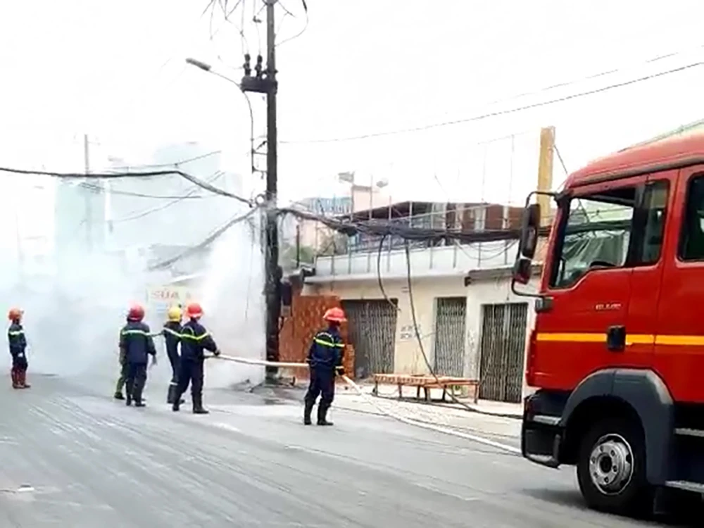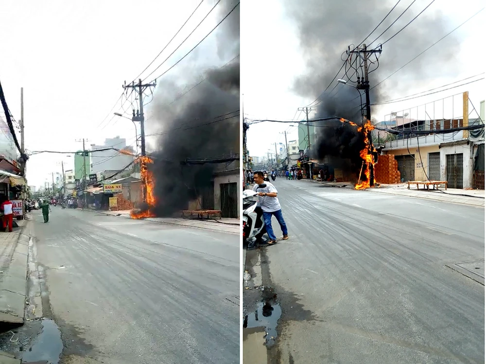 Trưa 24-4, trụ điện trên đường An Dương Vương (phường 11, quận 6, TP.HCM) bất ngờ bốc khói rồi cháy ngùn ngụt.