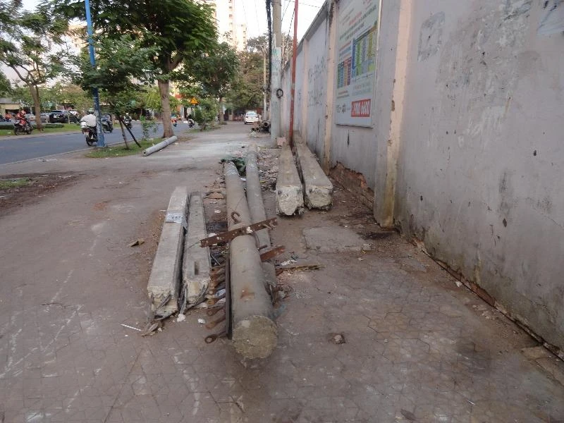 Trên đường Đồng Đen (đoạn cách đường Âu Cơ rẽ phải khoảng 100 m) thuộc địa bàn phường 10, quận Tân Bình, TP.HCM có những đống trụ điện hư nằm ngổn ngang trên vỉa hè.