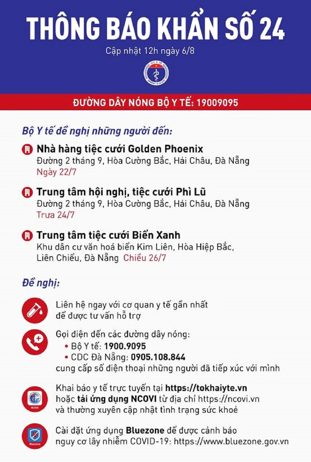Trưa 6-8, Bộ Y tế phát đi thông báo khẩn số 24, liên quan đến công tác phòng, chống dịch bệnh COVID-19.