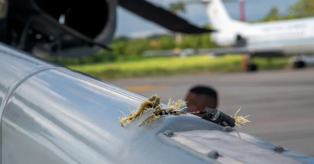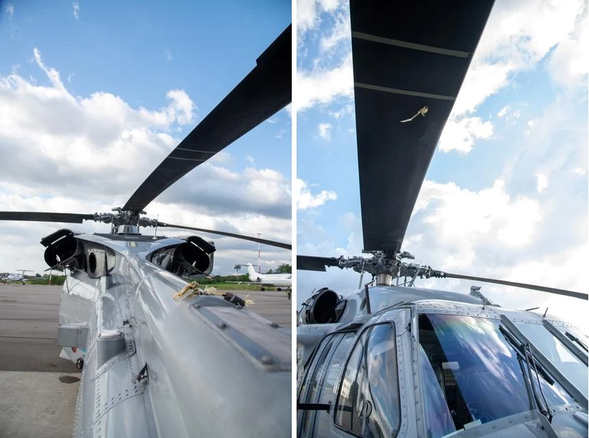 Một lổ thủng trên cánh và trên vỏ thân trực thăng của Tổng thống Colombia Ivan Duque. Ảnh: REUTERS