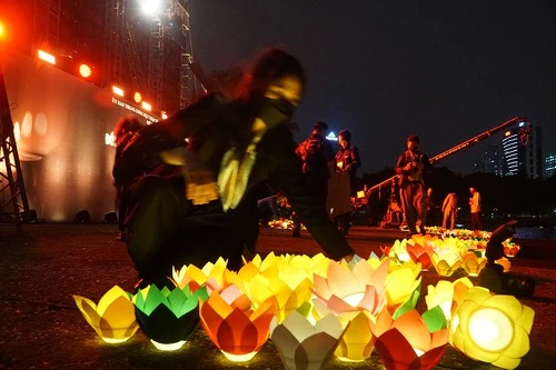 Nghi thức thả hoa đăng tưởng niệm tại chùa Pháp Hoa, quận 3, TP.HCM. Ảnh: NGUYỆT NHI