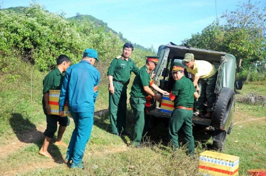 Lực lượng chức năng xếp các thùng chứa đầu đạn lên xe mang đi tiêu hủy. Ảnh: Cao Diên.
