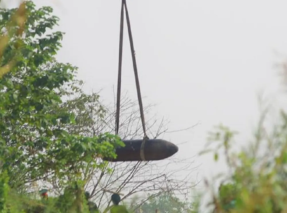 Quả bom được lực lượng bộ đổi cẩu lên, đưa đi nơi khác xử lý