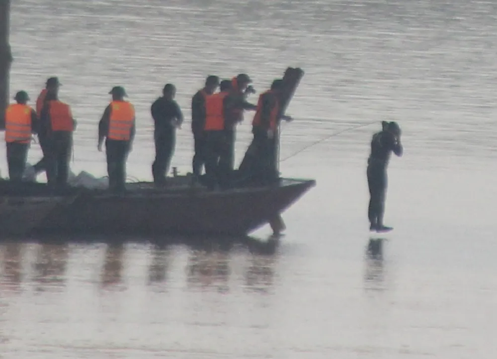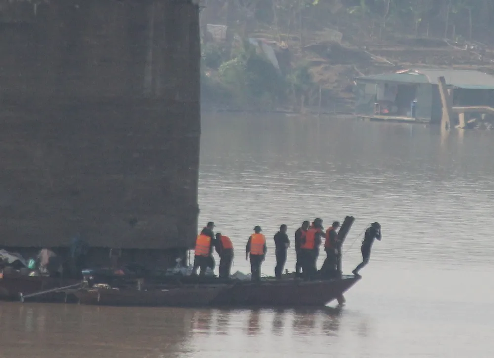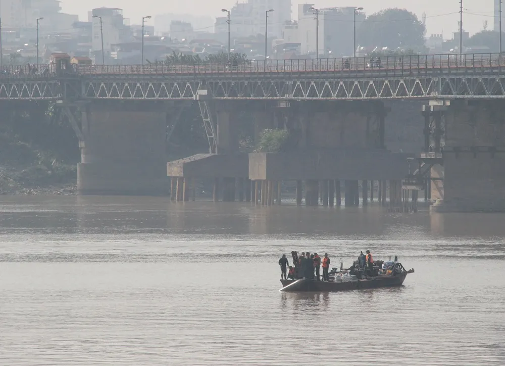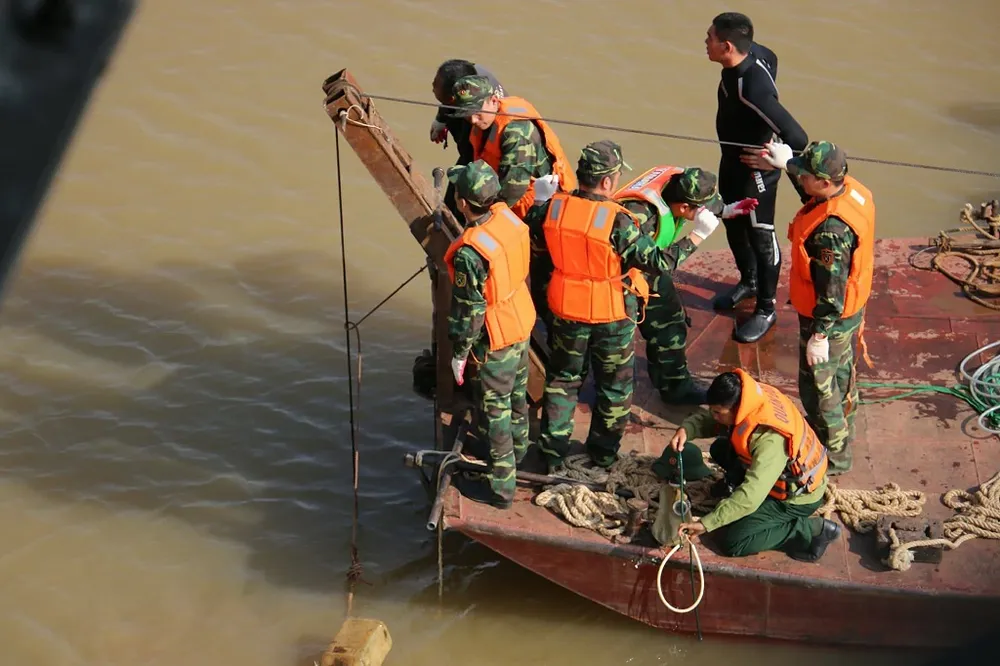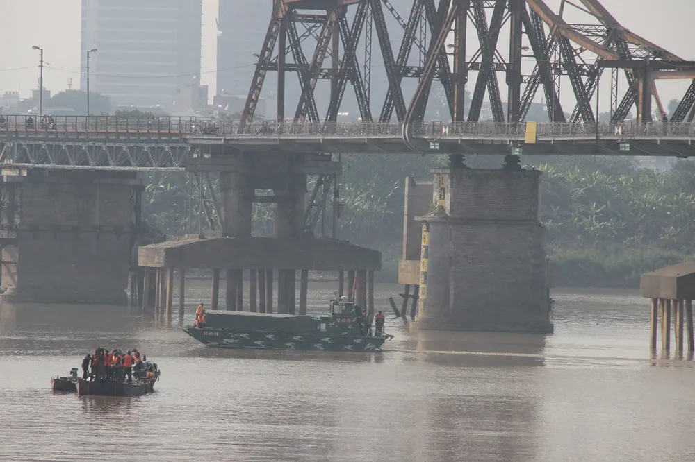 Chiều 28-11, lực lượng bộ đội tiến hành trục vớt quả bom nằm dưới chân cầu Long Biên.
