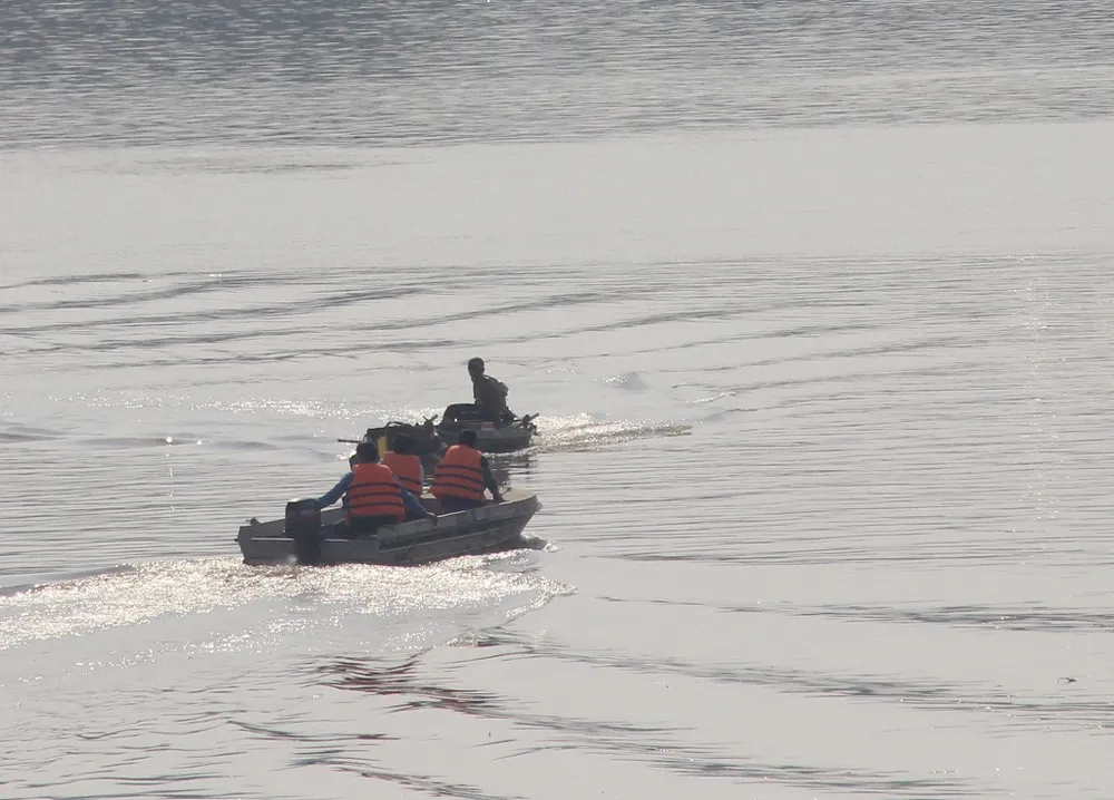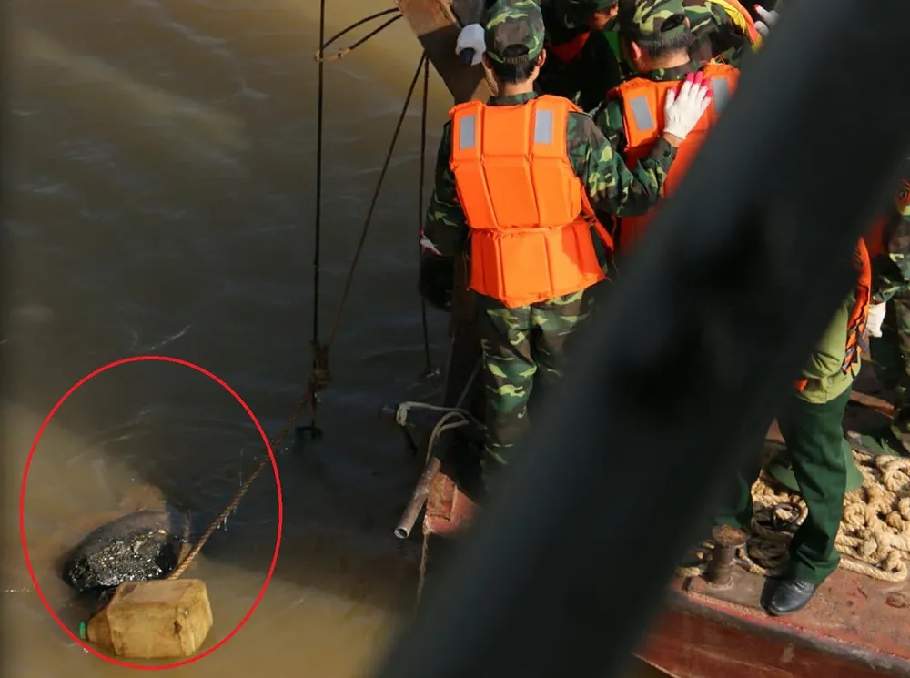 Quả bom được vớt lên thuyền để lai dắt vào bờ