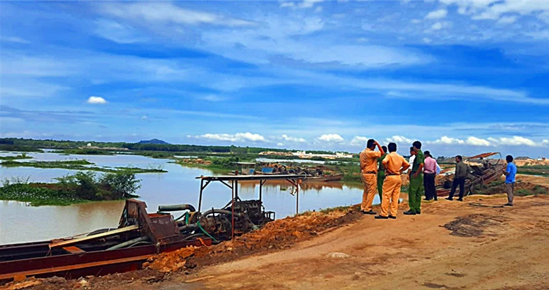 Cơ quan chức năng kiểm tra các tàu thuyền khai thác khoáng sản trái phép tại hồ Biển Lạc.