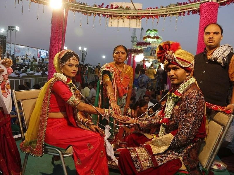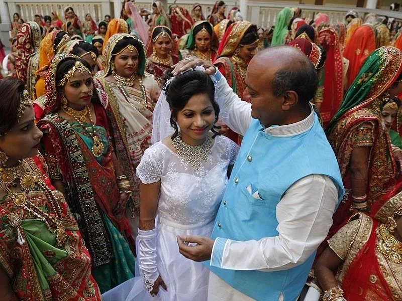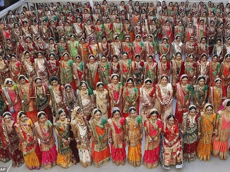 Lễ kết hôn tập thể diễn ra ở TP Surat, bang Gujarat, miền Tây Ấn Độ với sự tham gia của 251 cặp đôi trẻ, trong đó có năm cặp đôi theo đạo Hồi, một cặp đôi theo Cơ Đốc giáo và hai cô gái dương tính với HIV.