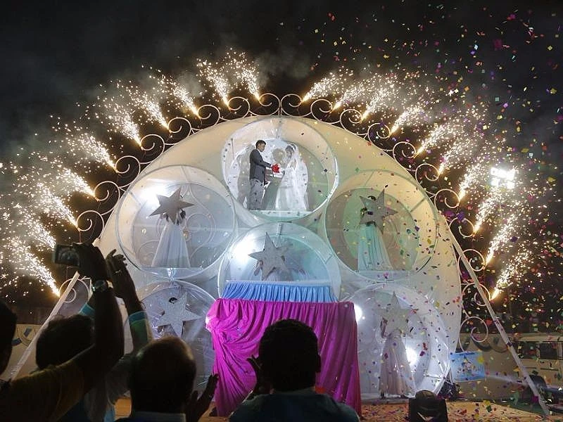 Một cặp đôi theo đạo Cơ Đốc tham gia nghi thức lễ cưới khi pháo bông được bắn ra giữa trời đêm. Ảnh: AP