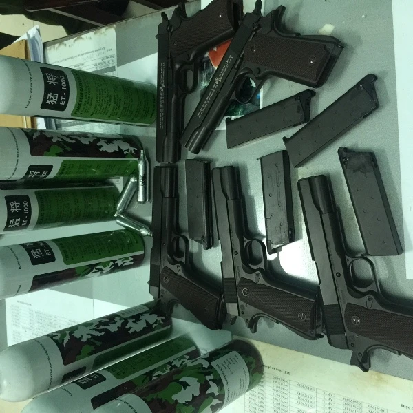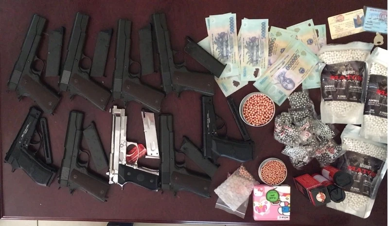 Qua kiểm tra tại chỗ và phòng trọ tại quận 12, tổ công tác tạm giữ các tang vật phương tiện gồm: 14 khẩu súng bắn đạn bi, 20 hộp tiếp đạn, 3.600 viên đạn bi bằng kim loại, 37 bình gas các loại, hai ĐTDĐ, ba thẻ ATM...