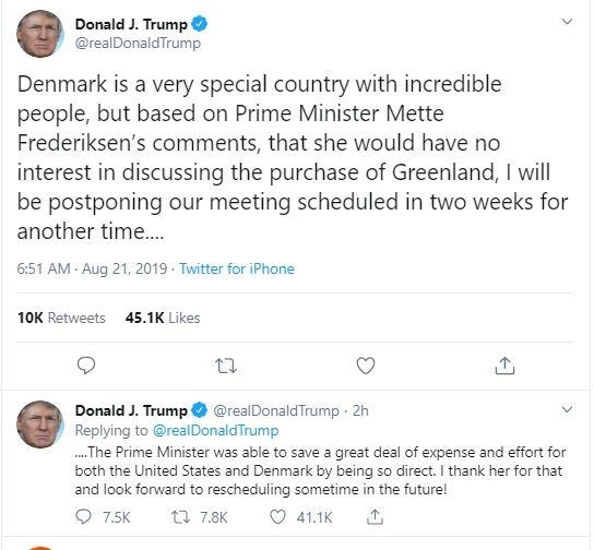 “Đan Mạch là một quốc gia đặc biệt với những con người tuyệt vời, nhưng dựa trên những bình luận của Thủ tướng Frederiksen, thì có ý rằng bà ấy không muốn thảo luận về việc mua đảo Greenland”, ông viết trên Twitter.