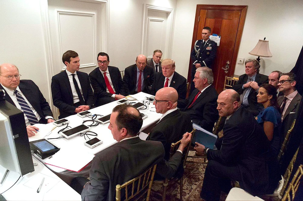 Ảnh chụp ông Trump cùng êkíp theo dõi về vụ phóng tên lửa Tomahawk vào Syria ngày 7-4. Ảnh: Nhà Trắng