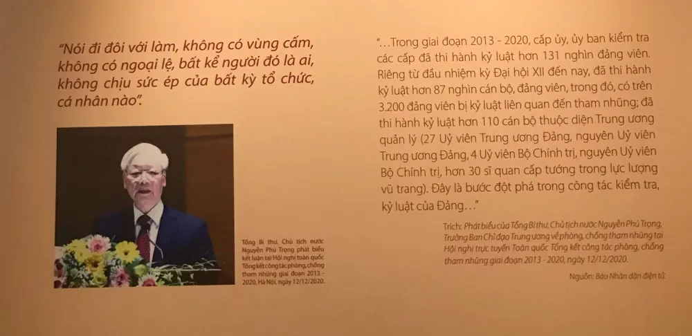 Một trong những bài phát biểu của Tổng Bí thư, Chủ tịch nước Nguyễn Phú Trọng được trưng bày tại triển lãm. Ảnh: VIẾT THỊNH
