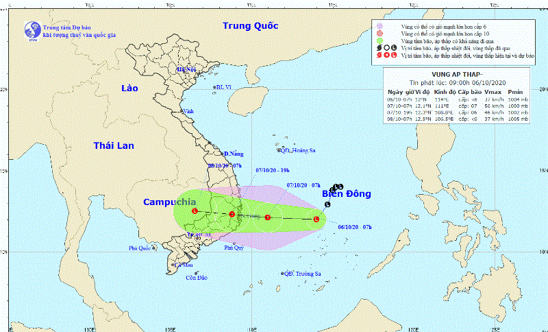 Theo NCHMF, sáng 6-10, tâm vùng áp thấp còn cách đảo Song Tử Tây khoảng 60km về phía bắc tây bắc. và đang di chuyển chủ yếu theo hướng tây, mỗi giờ đi được 10-15km và có khả năng mạnh lên thành áp thấp nhiệt đới (ATNĐ).