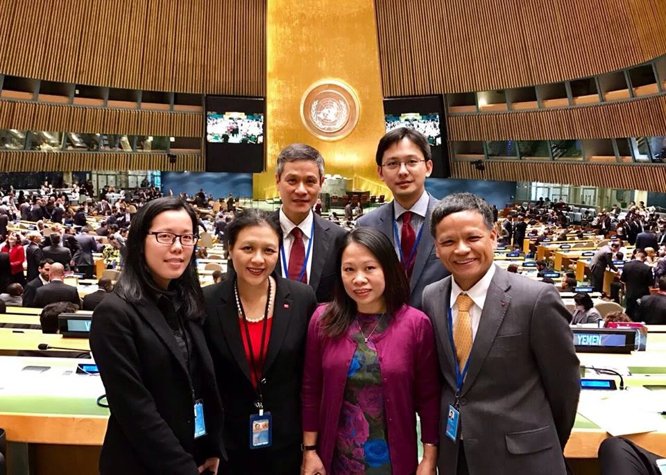 ĐS Nguyễn Hồng Thao (hàng trước, bìa phải) và ĐS Nguyễn Phương Nga (bên cạnh ĐS Thao) và cán bộ Phái đoàn Việt Nam bên cạnh LHQ. Ảnh: VNN