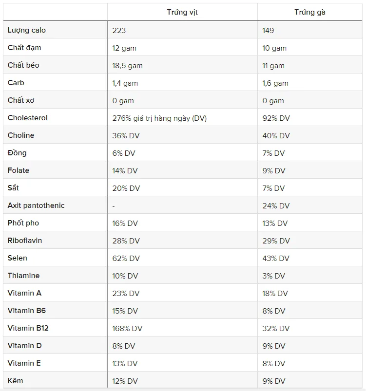 Bảng so sánh dinh dưỡng giữa trứng gà và trứng vịt.