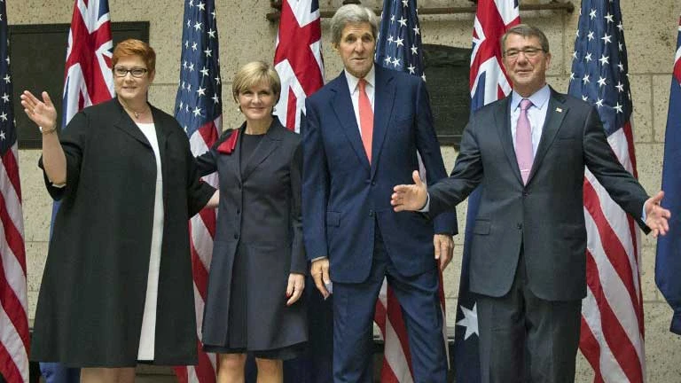 Từ trái sang: Bộ trưởng Quốc phòng Úc Marise Payne, Ngoại trưởng Úc Julie Bishop, Ngoại trưởng Mỹ John Kerry, Bộ trưởng Quốc phòng Mỹ Carter trong cuộc đàm phàm giữa hai nước.
