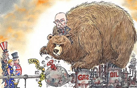 Nền kinh tế Nga nếu so ra chỉ tương đương với Ý. Thế nhưng Nga lại sở hữu nguồn dự trữ năng lượng khổng lồ. Các quốc gia EU là khu vực nhập khẩu đến 45% nguyên liệu thô từ Nga. Đức nhập khẩu đến 40% khí gas từ Nga. Và ngược lại, sản phẩm nhập khẩu từ EU vào Nga chỉ chiếm khoảng 3%. Hiện nhiều nước châu Âu phụ thuộc rất lớn vào nguồn cung cấp năng lượng của Nga. Như Ba Lan phụ thuộc đến 80%, các quốc gia Baltic và Phần Lan hầu như phụ thuộc 100%. Để đối phó với các đòn trừng phạt kinh tế, Nga tuyên bố công ty dầu khí Gazprom sẽ không phụ thuộc vào các hợp đồng nhập khẩu từ bên ngoài, ước tính giá trị hợp đồng lên đến 166 triệu bảng Anh.